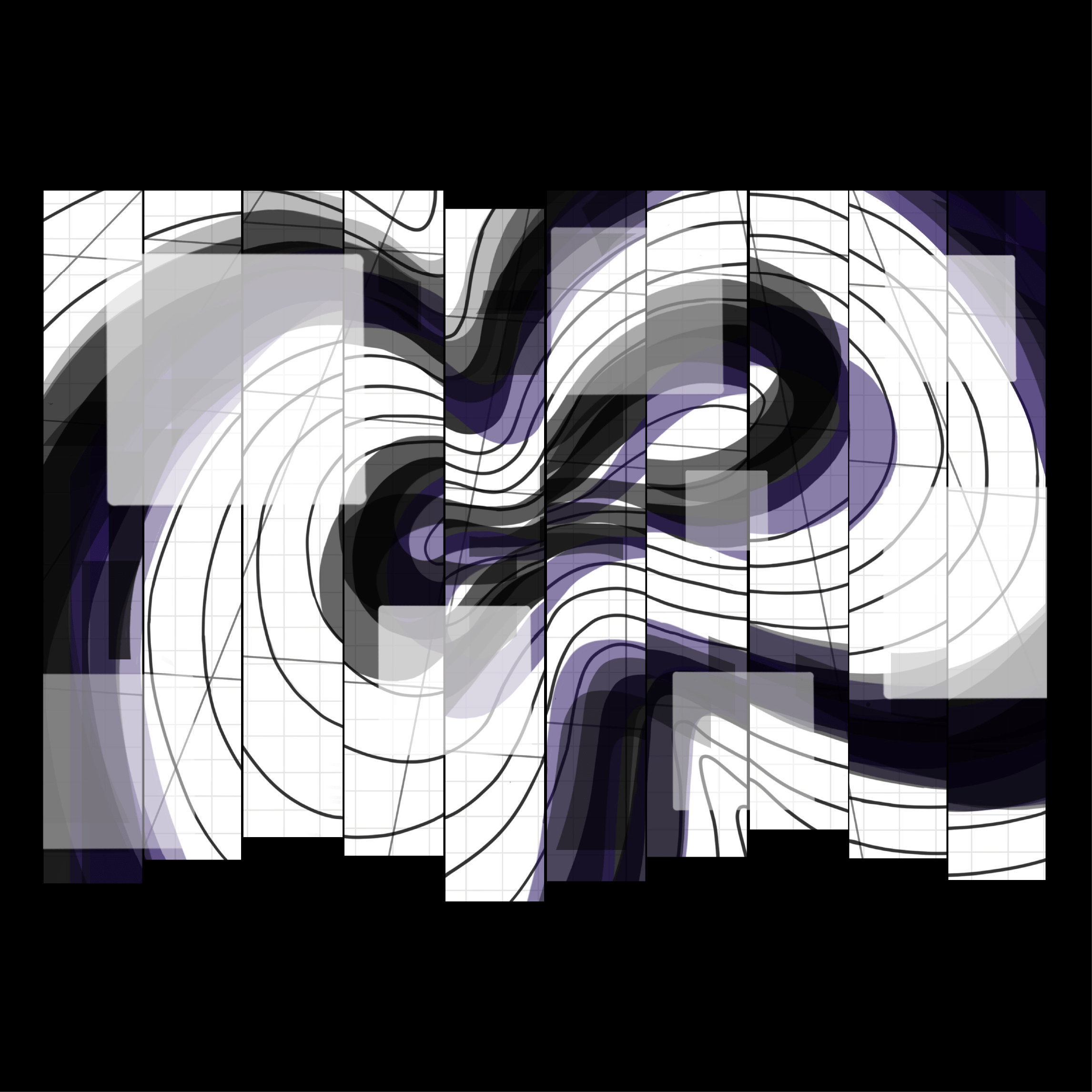 モチーフに天気図を用い、等圧線によって気圧の変化を表現しました。5本ごとに線を太くする天気図の特徴を活かし、等圧線を波紋状に配置することで、自然の力が外側へと広がっていく様子を視覚的に表現しています。また、画面に生じたずれは、自然の力がもたらす影響やゆらぎを象徴しています。これらの線は風や気圧の流れを示すと同時に、自然が秘める見えない力の存在と、その複雑で美しい動きを描き出しています。